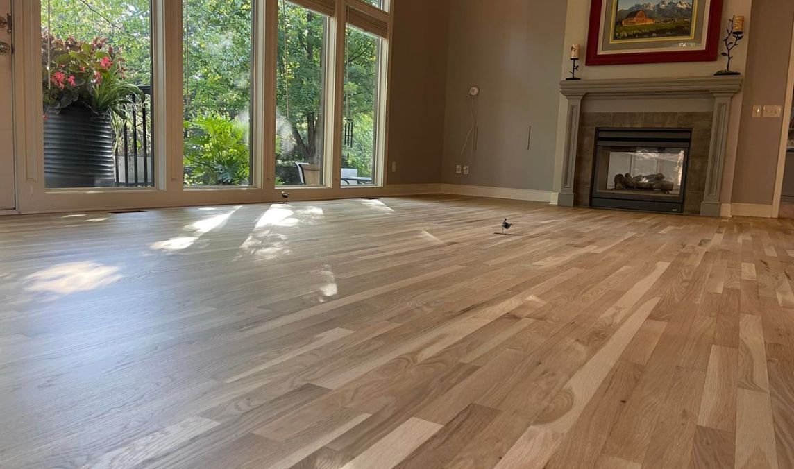 Hardwood floor refinishing in Leawood, KS: bright, wide-space living area with freshly finished light oak